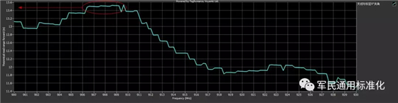 與上面圖11對應,圖12中顯示天線(xiàn)與標簽夾角為0°時(shí)所測得的標簽前向識讀距離整體表現很好,在整個(gè)測試頻段,均超過(guò)了10米。尤其在907MHz~909MHz這一段甚至超過(guò)了13米,表現非常優(yōu)秀。