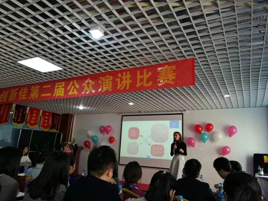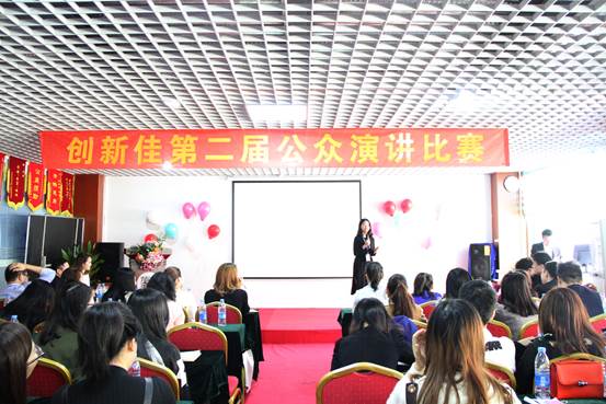 接下來(lái)演講比賽正式開(kāi)始,第一位出場(chǎng)的是創(chuàng )新佳客服部的經(jīng)理陳芳群,她演講的主題是《客戶(hù)接待講解》,用一個(gè)海底撈服務(wù)的故事引入自己的主題,講述了自己的接待客戶(hù)經(jīng)歷以及注意事項,字里行間透漏出客服部應有的細心與自信。