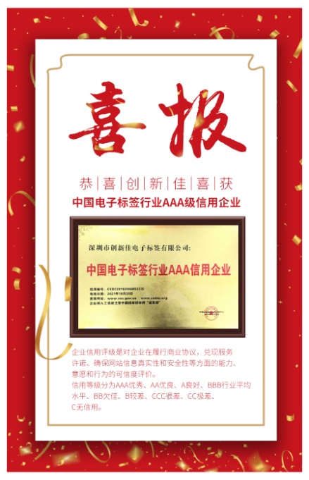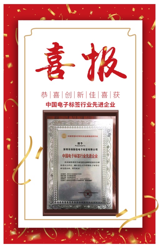 2018年11月13日,中國社會(huì )經(jīng)濟決策咨詢(xún)中心授予深圳市創(chuàng )新佳電子標簽有限公司“中國電子標簽行業(yè)AAA信用企業(yè)”,同時(shí),中國管理科學(xué)研究院品牌推進(jìn)委員會(huì )授予深圳市創(chuàng )新佳電子標簽有限公司“中國電子標簽行業(yè)先進(jìn)企業(yè)”。