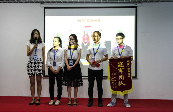 揭曉最后的一個(gè)獎項是團隊銷(xiāo)售冠軍——風(fēng)云一隊,在大家熱烈的掌聲中,登臺領(lǐng)獎,并發(fā)表獲獎感言:取此次成績(jì)是各個(gè)部門(mén)團隊協(xié)作的結果,感謝大家的幫助!希望繼續大家繼續努力,共創(chuàng )輝煌!